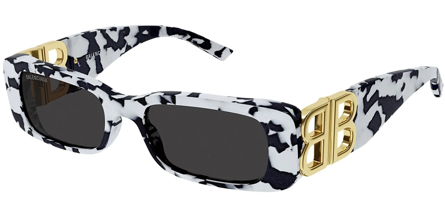 משקפי שמש באלנסיאגה יוניסקס דגם BB0096S 005 51-18-130 בשילוב צבעי זהב, חום, לבן, מנומר, שחור עם עדשות בצבע אפור. סגנון הדגם אלגנטי, יוקרתי, קלאסי, משקפיים עם קטע. מסגרת פלסטיק. לדגם זה צבעים נוספים.